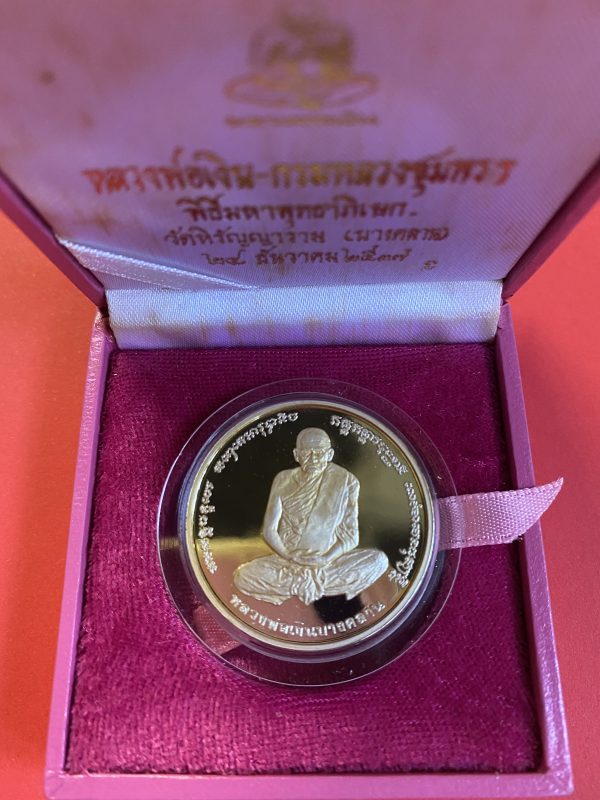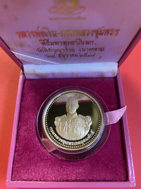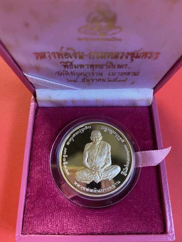 เหรียญหลวงพ่อเงินบางคลาน หลังกรมหลวงชุมพรฯ เนื้อเงินบริสุทธิ์ขัดเงาออกวันที่ 28 ธันวาคม ปี 2537 กล่องกำมะหยี่สีชมพูเดิม