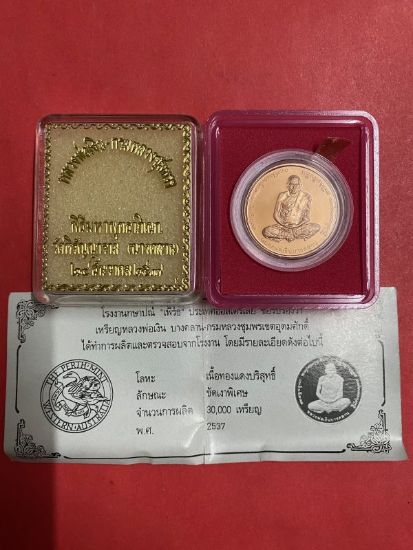 เหรียญหลวงพ่อเงินบางคลาน หลังกรมหลวงชุมพรฯ เนื้อเงินบริสุทธิ์ขัดเงาออกวันที่ 28 ธันวาคม ปี 2537 กล่องกำมะหยี่สีชมพูเดิม