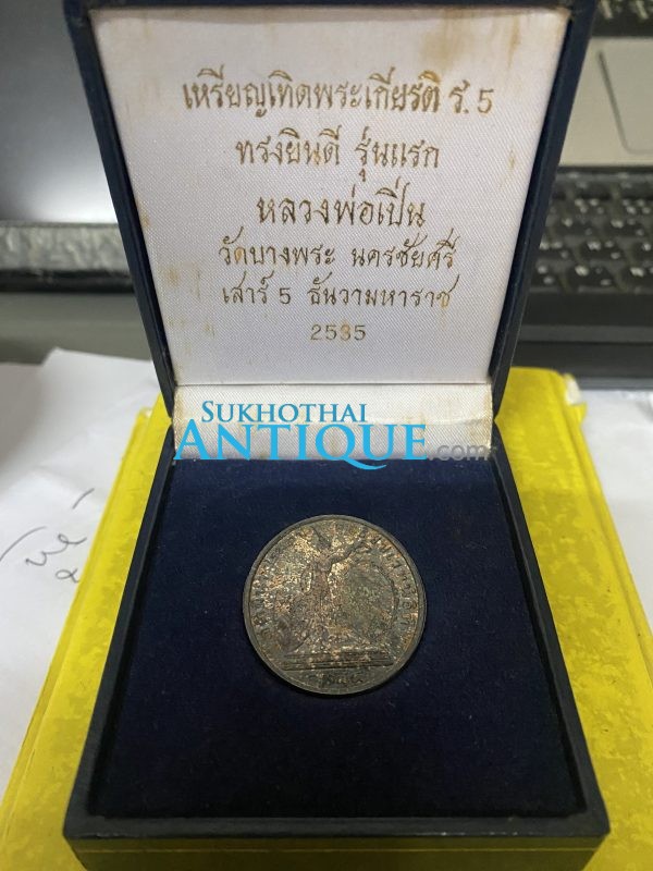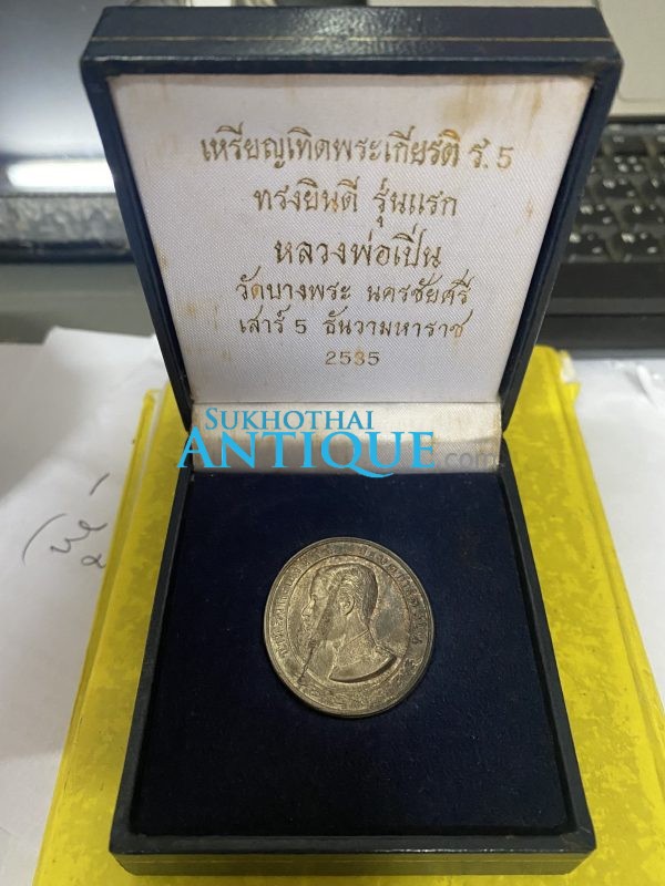 เหรียญเทิดพระเกียรติ ร,5 ทรงยินดีเนื้อเงิน รุ่นแรก หลวงพ่อเปิ่น วัดบางพระ นครชัยศรี เสาร์ 5 ธันวาคมหาราช 2535 พร้อมกล่องกำมะหยี่
