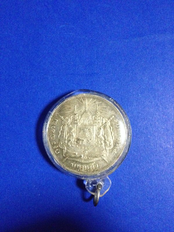 เหรียญเนื้อเงินหนึ่งบาท พระบรมรูป – ตราแผ่นดิน รัชกาลที่ 5 ร.ศ 122 ความสวยปรากฎสีรุ้งเดิมๆให้เห็น หายากครับสภาพนี้ เลี่ยมอยู่ในกรอบพลาสติก
