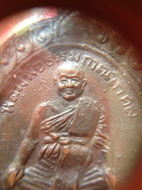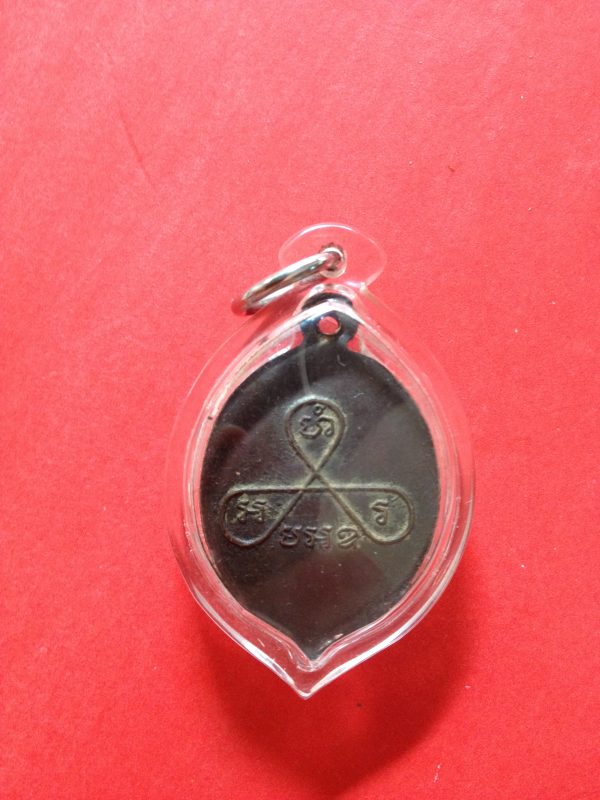 เหรียญใบพุทราหลวงปูู่เอมวัดคลองโป่ง ศรีสำโรง เนื้อทองแดงรุ่นครูเอื้อ เลี่ยมพลาสติกสวยงาม ปี 2535