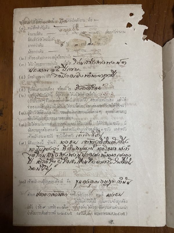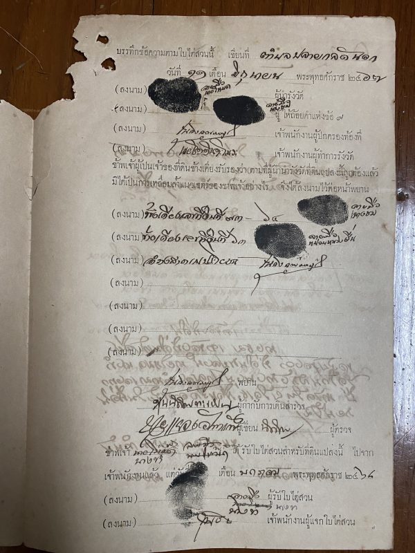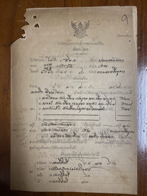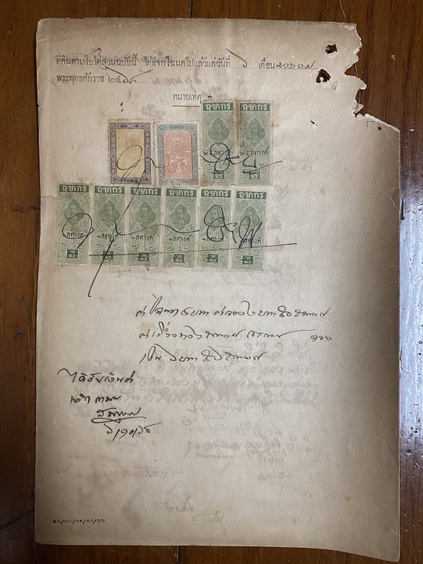 เอกสารเก่าเป็นใบไต่สวนในการเดินสำรวจหมายเขตร์ที่ดิน เพื่อออกโฉนด 11 มิย . 2467 ด้านหลังมีแสตมป์ฤชากรเก่ามากๆ 10 ดวง