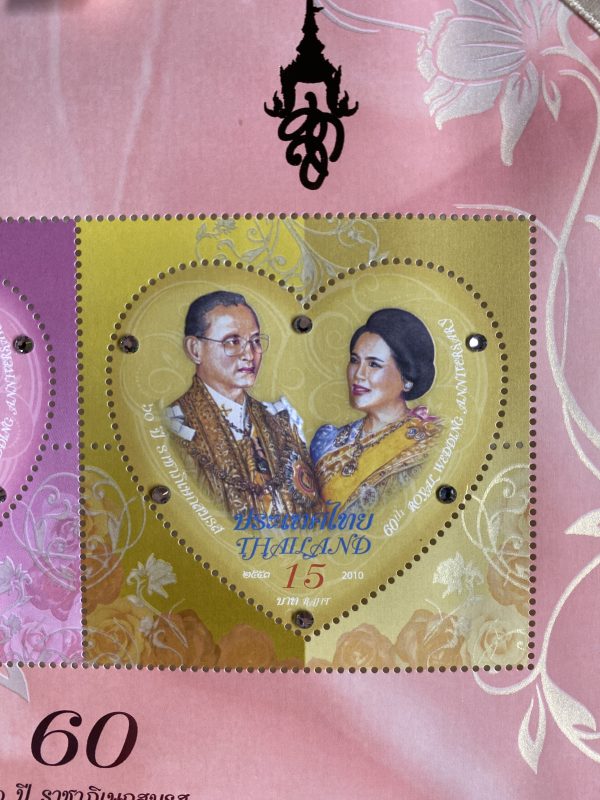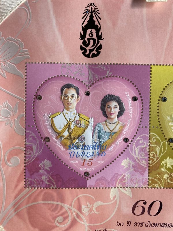แสตมป์ ชีท 60 ปี ราชาภิเษกสมรส รูปคู่ในหลวงรัชกาลที่ 9 พร้อมราชินี อยู่ในกล่องเดิมสีชมพู
