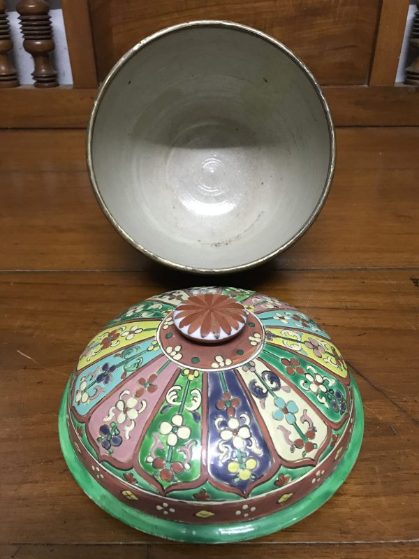 โถกระเบื้องเบญจรงค์สมัยอยุธยาตอนปลาย(รัตนโกสินทร์ตอนต้น) พร้อมฝา ลายกระจก สภาพค่อนข้างสมบูรณ์มีร้าว2เส้น ซ่อมสีที่เห็นภายในเล็กน้อย