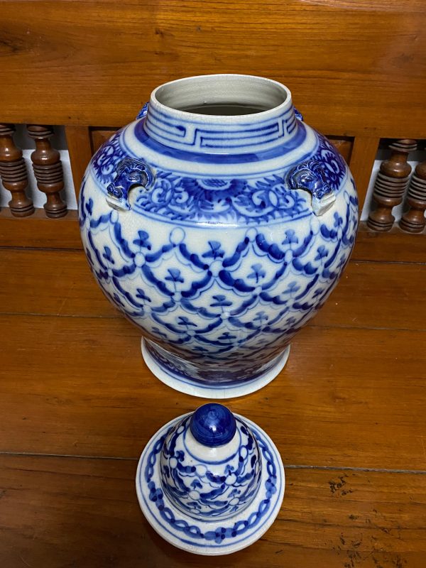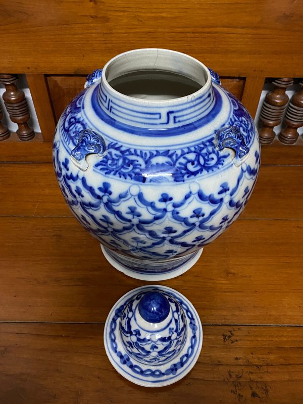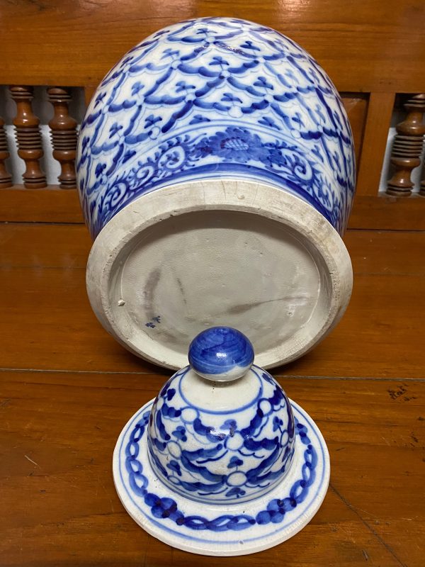 โถกระเบื้องโบราณสีขาวลายดอกสับปะรดสีน้ำเงินพร้อมฝา ทุกอย่างดูสมบูรณ์ไม่มีซ่อม หายามากครับสภาพนี้ สูงประมาณ19″X13″